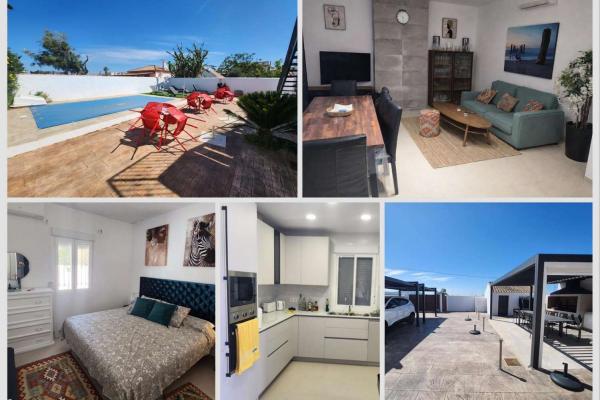 4 dormitorios, salón con chimenea, cocina (lavavajillas, horno, microondas), 2 cuartos baño completos. Aire acondicionado y TV...